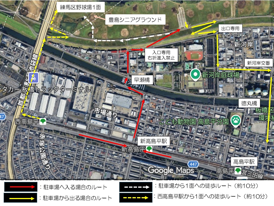 グランドへは都営三田線西高島平駅、下流側駐車場からいずれも徒歩10分ほどです。