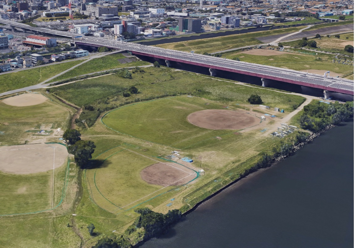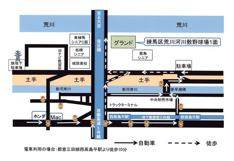 グランドへは都営三田線西高島平駅、下流側駐車場からいずれも徒歩10分ほどです。